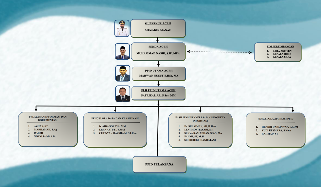 Dalam bertugas, PPID Aceh dibantu oleh Pejabat Fungsional Pengelola Informasi dan Dokumentasi yang meliputi Pelaksana Teknis/Administrasi, Arsiparis, Pranata Komputer, Pranata Humas, Pustakawan dan Pejabat Fungsional lainnya.